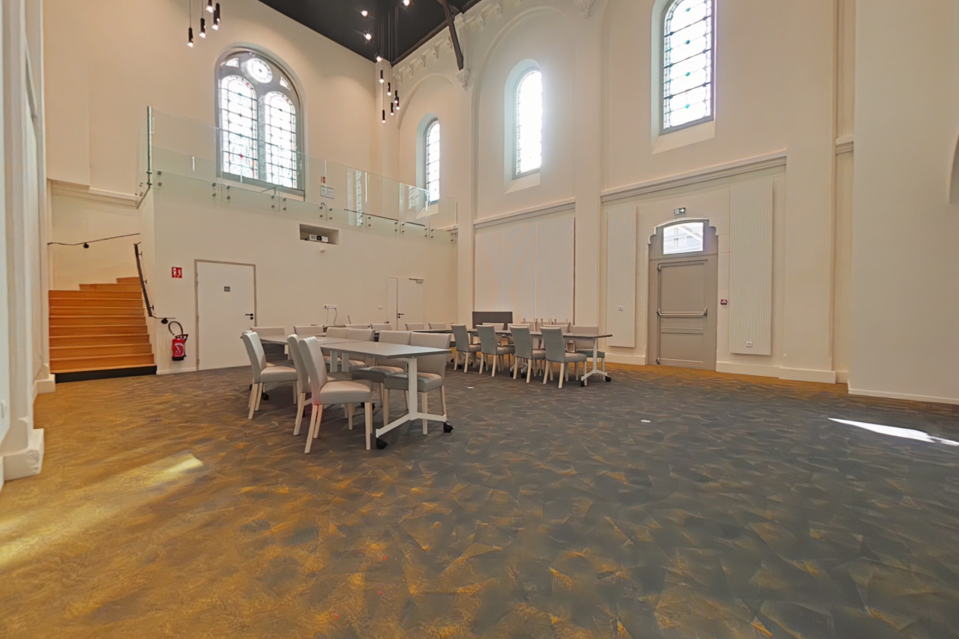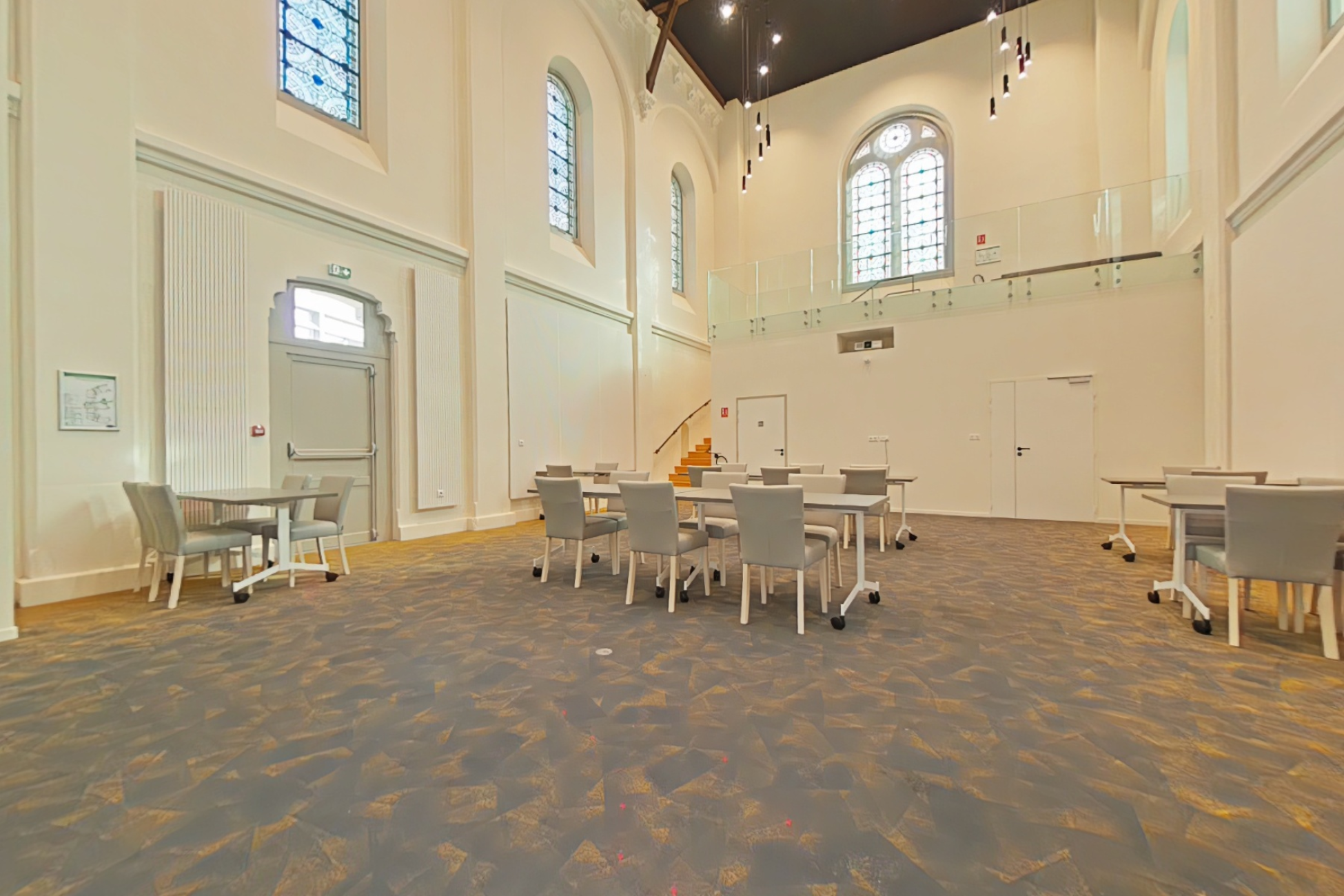 Équipée de 12 tables et 60 chaises, d’un rétro-projecteur haute définition projetant sur une surface d’environ 7m*4m, d’une kitchenette avec chambre froide, d’un espace de stockage et d’un accès dédié pour un traiteur.